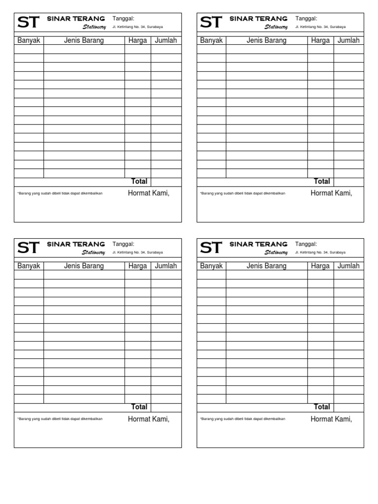 Contoh 1/4 folio landscape penjualan ms word format paxdhe mboxdhe download sederhana file excel yook. Aplikasi format kwitansi kosong diatas bisa anda download secara gratis di ms word maupun excel dan bisa dimasukan nominal sesuai keinginan. So please help us by uploading 1 new document or like us to download Download nota kosong dalam bentuk word documen docx sakaran from www.sakaran.com. 0 ratings0% found this document useful (0 votes).