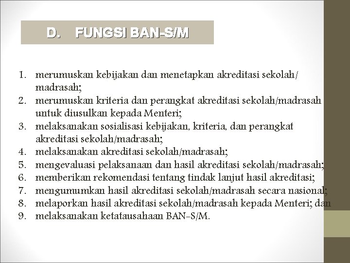 Akreditasi Sekolah Madrasah from image.slidesharecdn.com Sedangkan fungsi akreditasi sekolah adalah sebagai berikut: Fungsi akreditasi sekolah tersebut yaitu : Badan akreditasi nasional sekolah/madrasah sebagaimana disebutkan bahwa akreditasi sekolah/madrasah adalah proses penilaian secara komprehensif terhadap kelayakan satuan atau program pendidikan, yang hasilnya diwujudkan dalam bentuk pengakuan dan peringkat kelayakan dalam bentuk yang diterbitkan oleh suatu lembaga yang mandiri dan profesional. Oleh karena itu pendidikan harus dikelola atau manage secara baik agar hasil atau kinerja pendidikan dapat optimal dalam. 2 jenjang pendidikan di sekolah. Pedoman ini disusun sebagai manifestasi fungsi dan tanggung jawab bans/m dalam melaksanakan program akreditasi sekolah/madrasah. Salah satu bentuk pertanggungjawaban sekolah/madrasah sebagai lembaga pelayanan publik Berdasarkan permendikbud nomor 59 tahun 2012 (pasal 1 ayat 2) badan akreditasi nasional sekolah/madrasah adalah badan evaluasi mandiri yang menetapkan kelayakan program dan satuan pendidikan jenjang pendidikan dasar dan menengah jalur formal dengan mengacu pada standar nasional pendidikan.