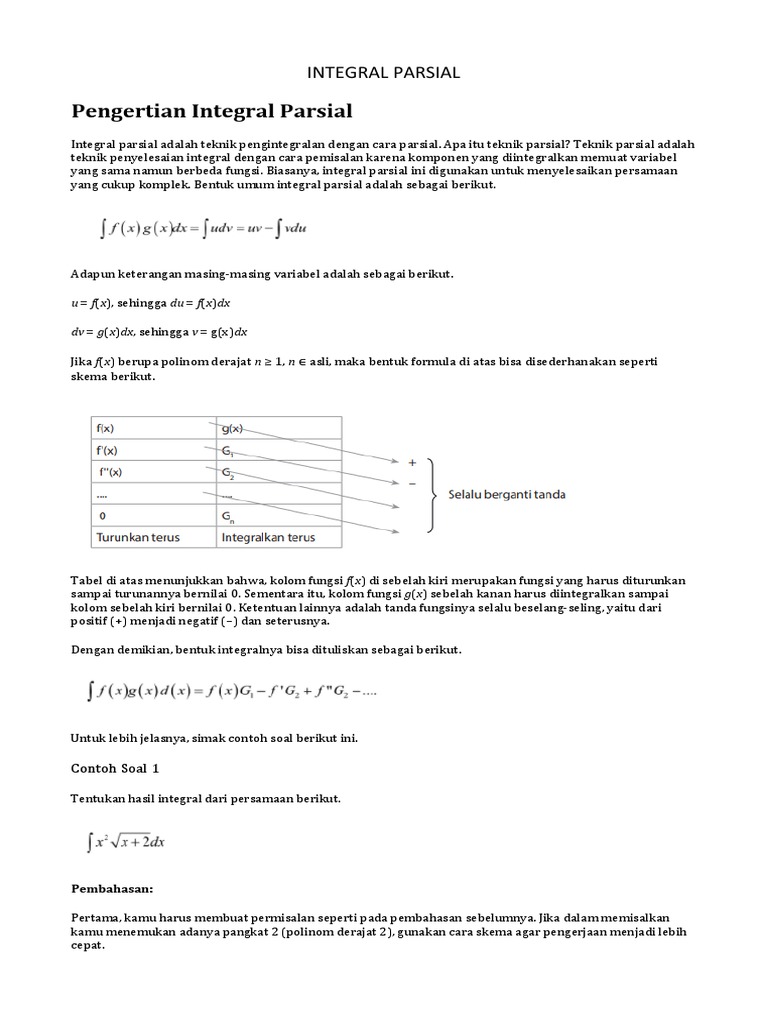 Contoh di bawah ini, penyelesaian integral parsial perlu dilakukan tiga kali. Adapun persamaan yang biasa digunakan oleh para fisikawan antarariksa untuk menentukan kecepatan roket adalah sebagai berikut. Oleh sebab itu, integral v(t) harus dilakukan menggunakan integral parsial. Agar lebih paham, simak contoh soal berikut ini. Berikut diberikan dua metode cara untuk menyelesaikan type soal integral parsial. Apr 05, 2020 · 1. Cara yang lain itu bisa meliputi integral substitusi dan lain sebagainya. Kamu akan lebih mudah memahami integral trigonometri jika sebelumnya pernah belajar tentang turunan trigonometri. Hal itu karena integral merupakan bentuk antiturunan. Ingat kembali rumus dasar untuk materi integral parsial sebagai berikut. Jika masih terdapat bentuk integral berarti prosesnya belum selesai. Konsep dasar integral substitusi parsial ini adalah mengubah integral kompleks ke dalam bentuk yang lebih sederhana. Mengingat fungsi sin xdan cos xbisa diintegralkan secara terus menerus, maka teknik parsial berlaku dalam hal ini.