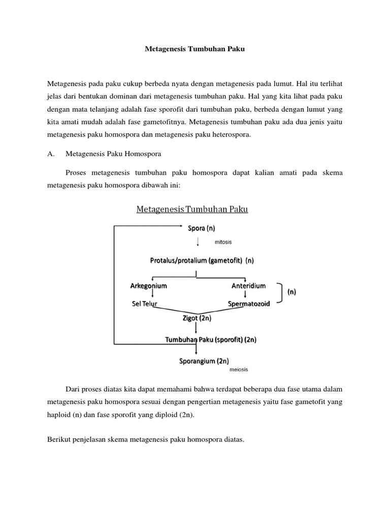 Paku peralihan (paku berumah dua) yaitu tumbuhan paku yang menghasilkan spora dengan bentuk yang sama, tetapi jenisnya berbeda (berkelamin jantan dan betina). Tumbuhan paku mengalami pergantian keturunan atau yang disebut sebagai metagenesis. Skema pergiliran keturunan (metagenesis) pada tumbuhan paku heterospora. Adapun skema metagenesis secara lengkap sebagai berikut. Ada yang namanya paku homospora, paku heterospora, dan paku peralihan. Skema metagenesis pada tumbuhan paku homospora. Dibawah ini adalah contoh skema metagenesis tumbuhan paku kayu dyroptery skema metagenesis tumbuhan paku kayu dryopterus dari gambar skema metagenesis paku diatas kalian dapat mempelajari dan memahami banyak hal salah satunya adalah penampakan anteridium dan arkegonium pada protalus atau protalium. Lakukan kajian literatur dari berbagai sumber yang ada mengenai metagenesis tumbuhan paku heterospora dan tumbuhan paku peralihan., kemudian buatlah skema metagenesis tumbuhan paku heterospora dan juga skema metagenesis tumbuhan paku peralihan. Skema metagenesis pada tumbuhan paku peralihan. Selain menggunakan spora, beberapa jenis tumbuhan paku bereproduksi vegetatif dengan beberapa cara berikut. Sel induk spora yang diploid akan mengalami pembelahan secara meiosis membentu k spora yang haploid (n). Berikut adalah bagan metagenesis tumbuhan paku. Umbi batang, misal marsilea crenata.